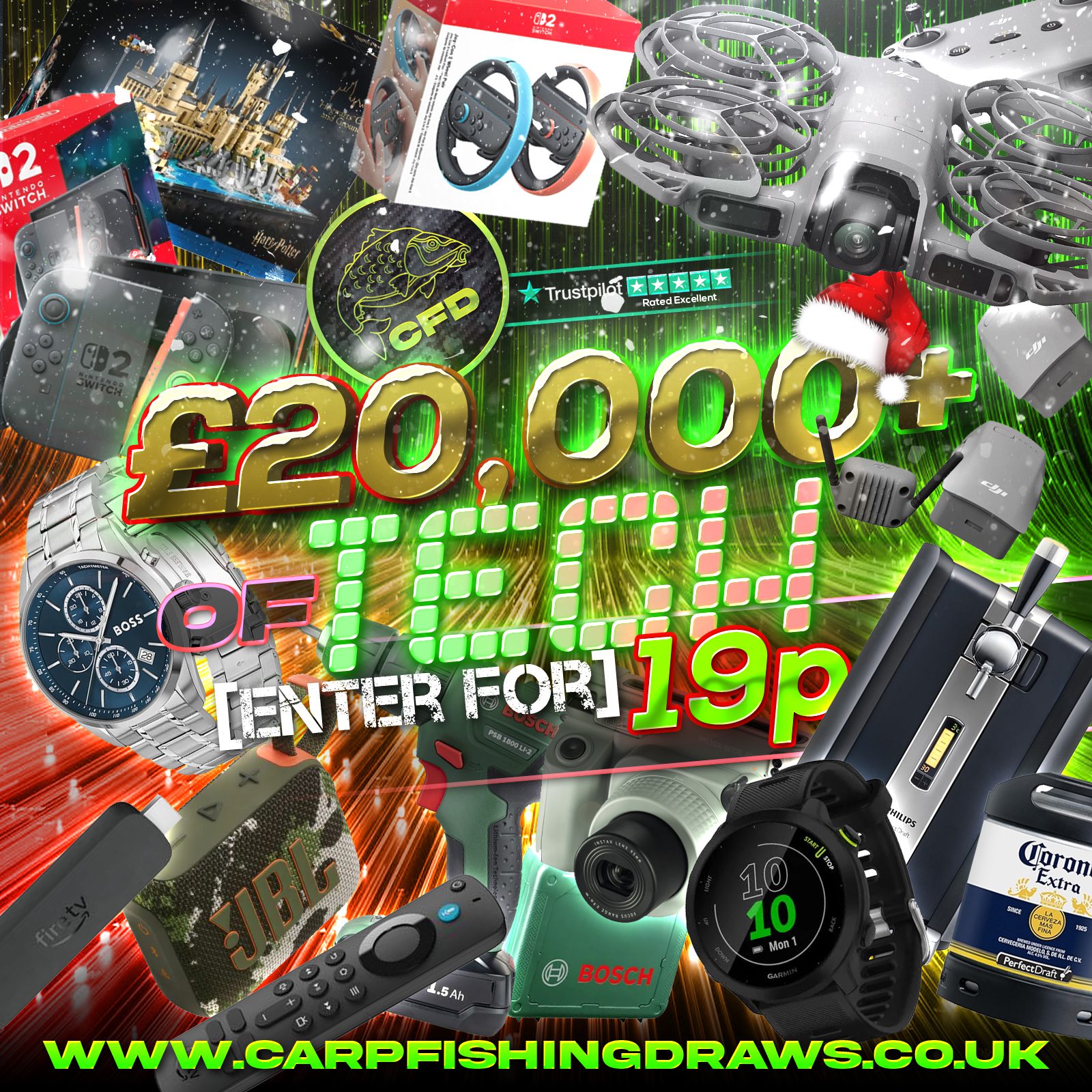 The live draw will take place on the Carp Fishing Draws Facebook page using Google’s random number generator to select the winning ticket number from all Entrants.