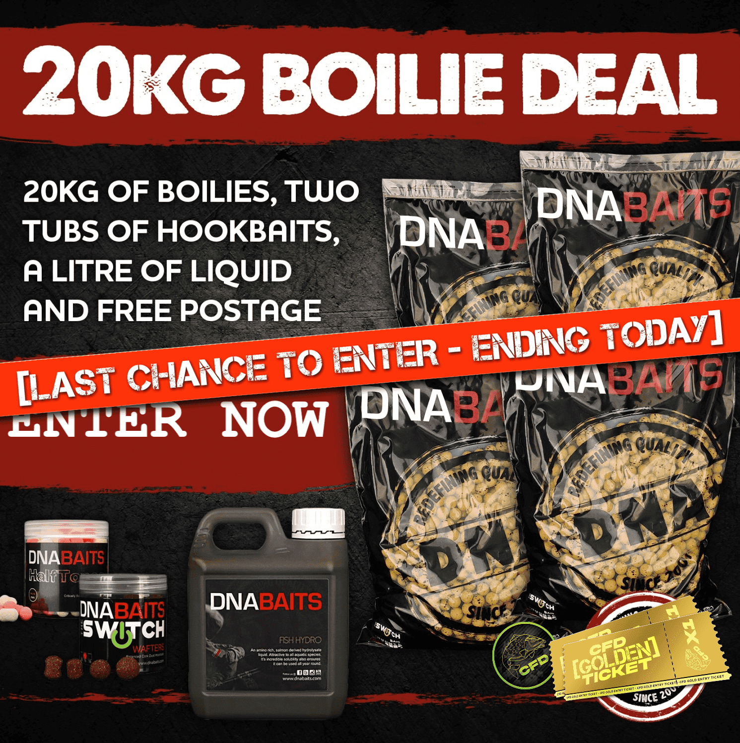 20kg of your choice of boilies in shelf life or freezer, plus two tubs of hookbaits and a litre of liquid (now with the option of 250ml Bait Soak or Liquid Food, plus loads more choice!)