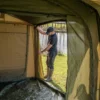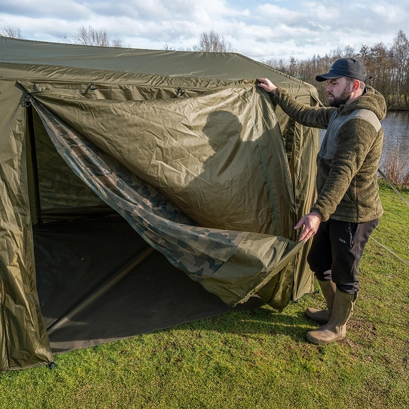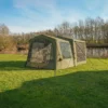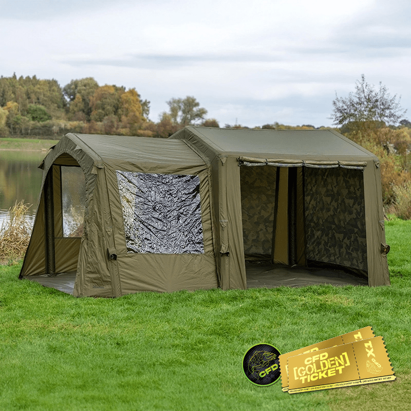 Avid Carp Inflatahouse Compact features a fully inflatable frame, the InflataHouse delivers the ultimate social shelter for longer sessions, combining spacious comfort with rapid, single-person setup. The inflatable frame design drastically cuts down set-up and pack-away times, while offering exceptional stability in challenging weather conditions. Constructed from durable 10,000mm hydrostatic head khaki fabric, ensuring complete protection from the elements. Includes a zip-on extended tunnel porch with large PVC side windows – ideal for socialising while keeping a view of the lake. Supplied with two interchangeable front panels: a solid infill and a full mosquito mesh, both of which can be attached to the main shelter or porch for total versatility. Side and rear panels feature integrated mosquito mesh and solid infills, allowing airflow or complete closure. They also enable side access or bivvy placement from multiple angles. Comes with an internal roof vapour shield, significantly reducing condensation and improving insulation during colder months. Also includes a pressure gauge pump, double-point reflective storm straps, heavy-duty pegs, a bespoke carry bag, puncture repair kit, and two clip-in heavy-duty groundsheets (for main shelter and the porch).