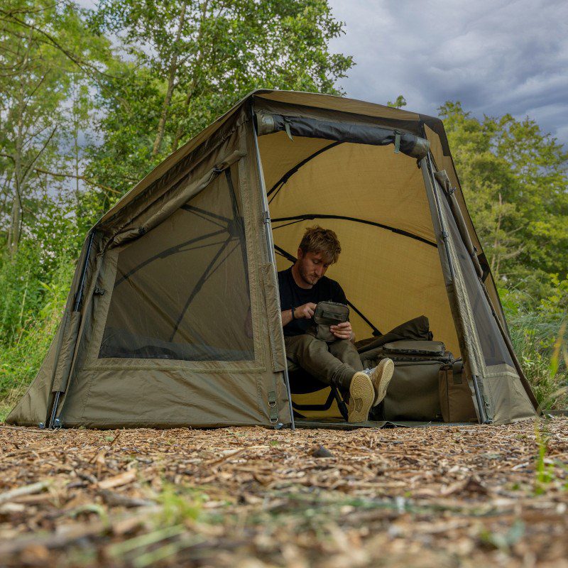 The Avid Carp Revolve 60 Inch Brolly System, a complete lightweight shelter that offers exceptional performance at a reasonable price. Manufactured with a fibreglass frame and supplied with both a PVC and solid door. The front panel can be rolled back up, or zipped off to create an open fronted shelter. They also come with a lightweight groundsheet and storm poles featuring AVID cams.