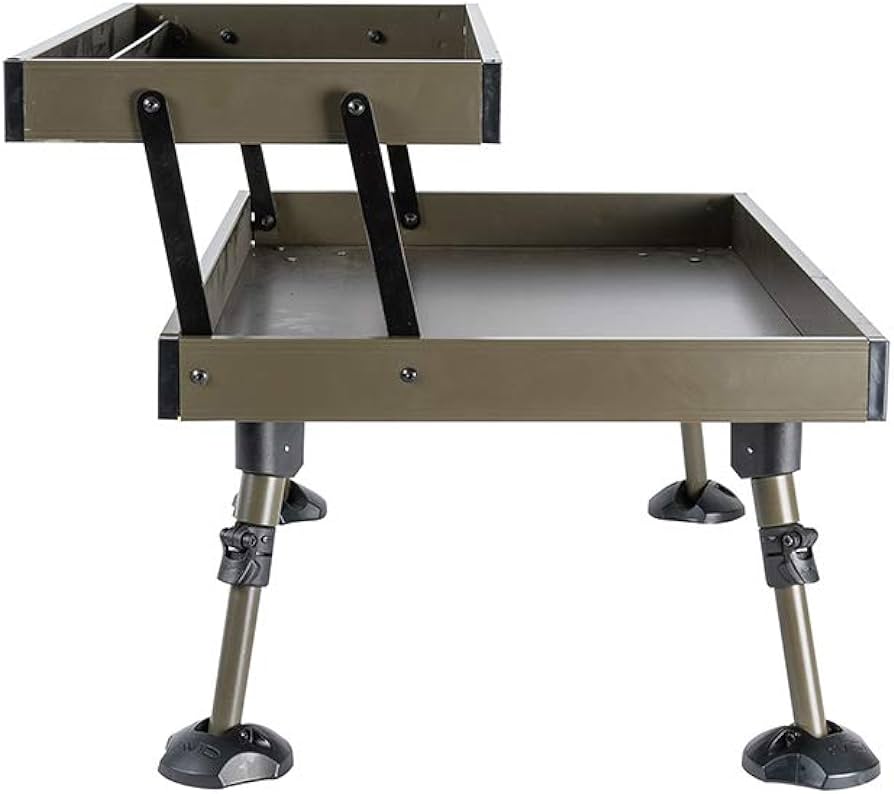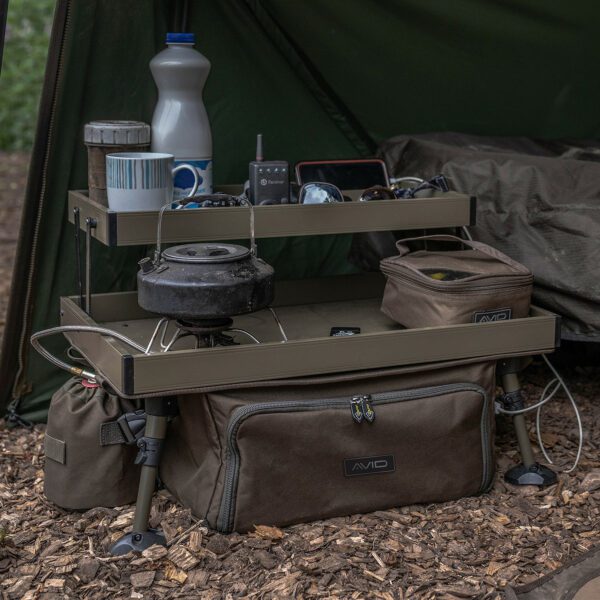 The Double Decker Bivvy Organiser features a two-tier tabletop for maximum storage of essential items. The Organiser pouch houses more sizeable tackle items in the lower compartments.