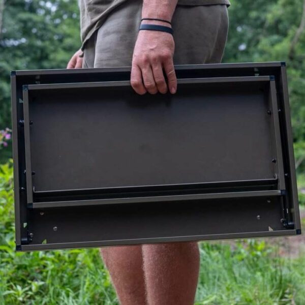 The hinged upper tier features a retaining bar along the back edge which can be used to hold you tablet or phone in the perfect position for watching video on your device and easily folds flat for minimum pack downsize when in transit on the barrow and in your vehicle, whilst the legs fold away neatly against the tables frame.