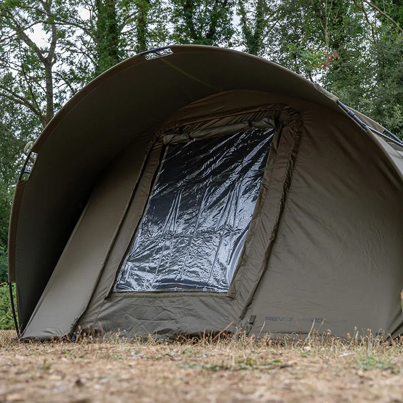 Avid Revolve NG Bivvy 2 Man, the next generation of the hugely popular Revolve bivvy, offering an affordable, high-quality and spacious 1-person shelter for budget-conscious anglers. Manufactured from a 10,000mm hydrostatic head black-out Khaki fabric. Featuring a twin-rib, flat-back, pram-hood design with a large extended peak for extra protection from the elements. The front of the shelter can be rolled back to create an open-fronted bivvy, while the two-way letterbox-style door features an integrated mesh panel and PVC window. Supplied with a lightweight groundsheet, heavy-duty pegs, frame support poles and an oversized zipped carry bag.