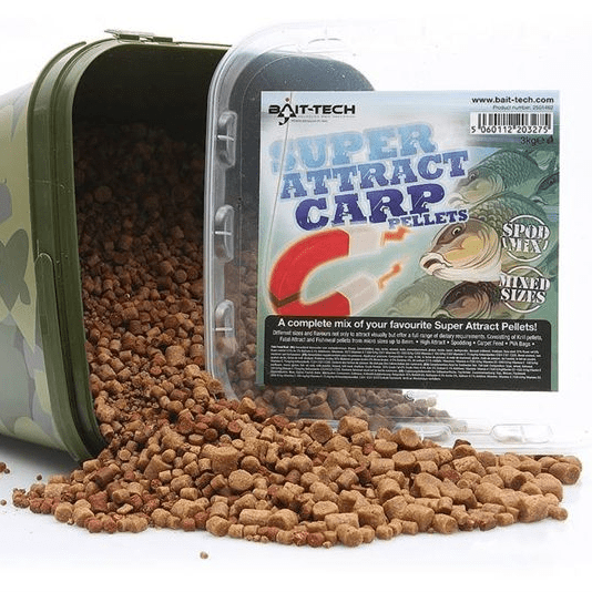 Bait-Tech Super Attract Carp Fishing Pellets 3kg, Bait-Techs Camo Buckets have a huge following. Now with more buckets added to the list of hot favorites, we have met the anglers needs with a variety of pellet mixes all proven fish catchers! Super Attract Carp Pellets Mixed sizes Fishmeal, Krill & Fatal Attract pellets gives off massive attraction and varying nutrient contents.