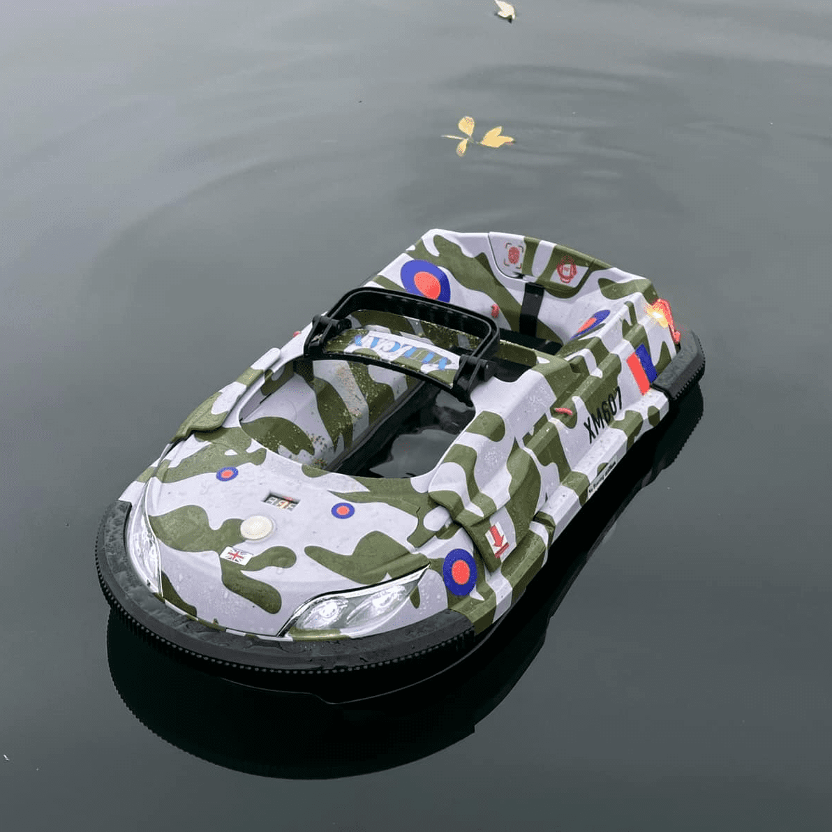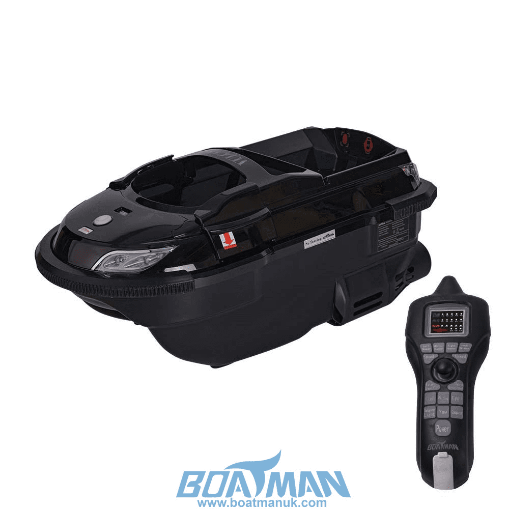 Here is the long awaited Boatman Vulcan. This boat has been designed here in the Uk by the Boatman Uk team. We wanted a boat with the ability to load the rig from the top which makes sending your rig and some free offerings an absolute doddle. The boats have 2 stainless steel bombay door style hoppers which can be opened individual or together, the doors are manual close. We have chosen a volt meter over a battery gauge, the minimum working voltage is 14. When the boats get to having less than 500 meters of range in battery life, the boats headlights will start to flash to warn you. If you go to a slower speed then the boat will go for a longer period of time. The boats come in 3 colours, Carbon, Black or Vulcan Camouflage, Sold in basic or GPS,This version being the basic. The remote is single handed with nice large buttons which are easy to read and a screen with display for the battery percentage and the remote. A feature we incorporated with the boat and remote is to be 100% waterproof. The remote will float in water so if you have an accident you will not need to replace an expensive remote. The boat is also designed to be fully waterproof, Numerous test have been done where the boat has been submerged and no water is taken on, Most boats are only waterproof to a certain level whereas this is entirely waterproof. The boats take 2 10ah batteries which just slot in each side so no fiddly plugs to play with. The run time is between 2-5 hours depending on the chosen boat speed which is selectable on the remote. High speed is 60 meters per minute, medium is 45 meters per minute, slow is 30 meters per minute. The slow speed is ideal if towing a deeper etc for scanning the lake bead for features. There is and additional clip on handle supplied with boats for use when filling the hoppers to the top to avoid putting your hands in the boat. The motors have a built in weed guard / protector and are incredibly quiet, virtually silent. The boat will hold up to 2.5kgs of weight. As with all of our models the boats have 500m of range and have compass compatibility built in. The main board is easily accessible and is encased in a full waterproof casing which means if you have a basic version and wish to upgrade to GPS at a later date it is incredibly easy. The lights are very bright which is something we made sure was improved upon for night fishing, You will certainly not lose sight of this boat in the dark. As with all of the boatman boats now, these also have compass built into the board as standard