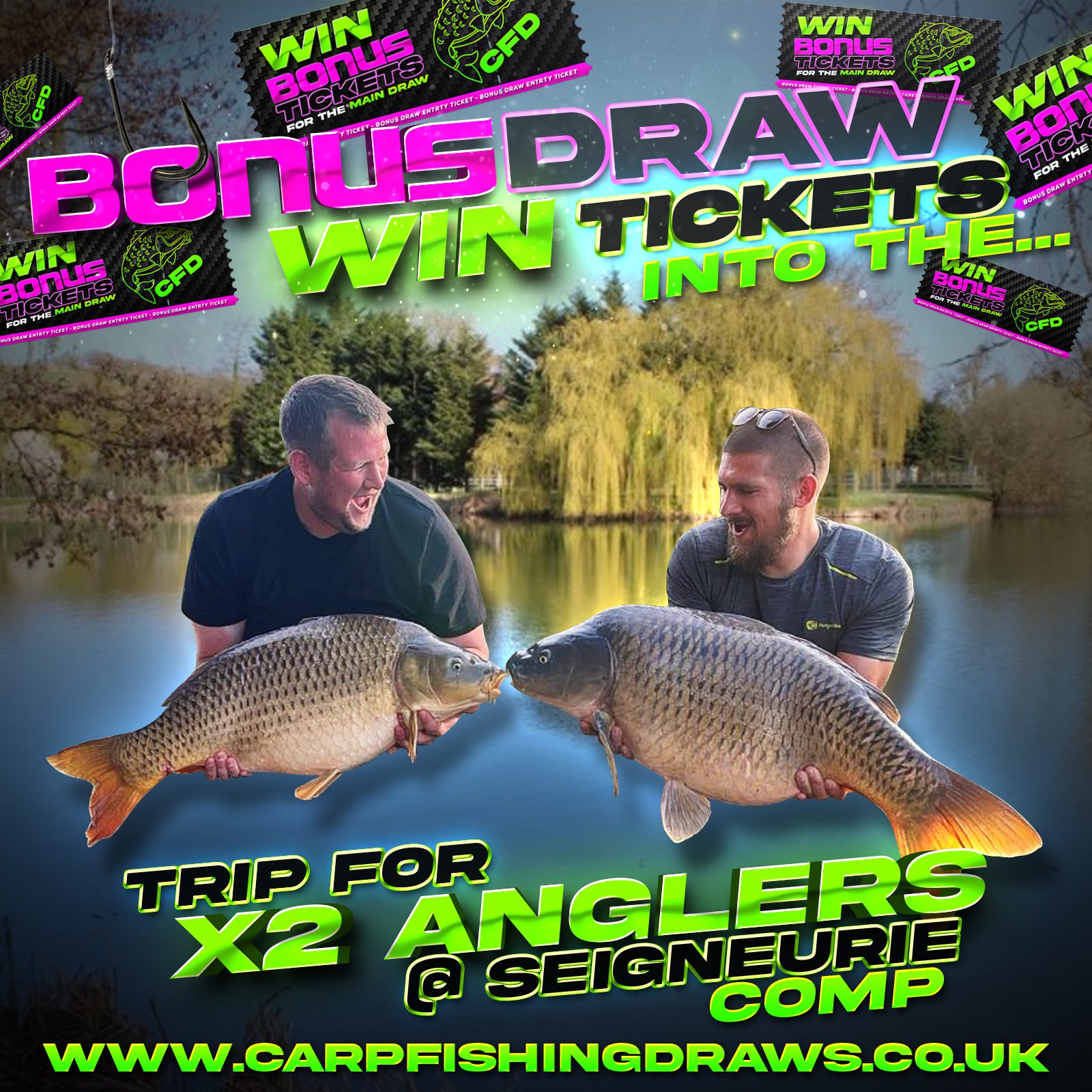 The live draw will take place on the Carp Fishing Draws Facebook page using Google’s random number generator to select the winning ticket number from all Entrants.
