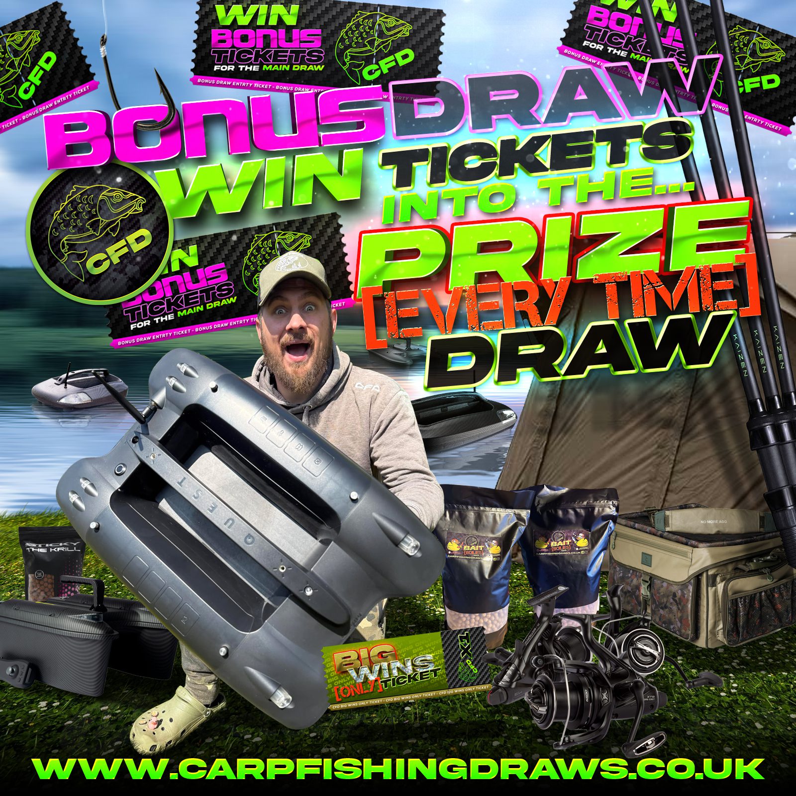 You may enter the competition online or for free by post by sending your entry to Carp Fishing Draws on a postcard. You must have an account on Carp Fishing Draws for your entry to be processed. All details on your entry MUST correspond to the details on your account to receive the order confirmation and ticket number. Postal entries received without a registered account cannot be processed.