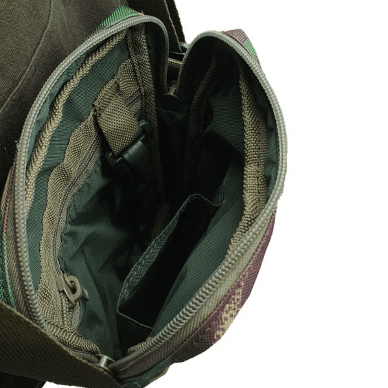 A compact shoulder bag designed primarily to keep all those valuables safe and secure but alternatively could make a good stalking bag. The main body is zipped with double pullers and enclosed within is a small open pocket suitable for phones and wallets and a zipped flat pocket, also a small snap hook for keys and the like. On the front and rear are handy zipped pockets. An easy access top flap covers the front of the bag adding security to the main body and front pocket. The bag is fully lined and has adjustable shoulder strap enabling it to be carried over the shoulder or across the body.