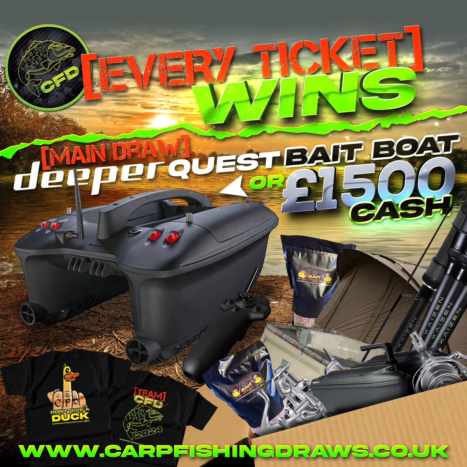 Every ticket is automatically entered for the chance to win Instant Win Prizes, as well as the end draw for a Deeper Quest Bait Boat or Β£1,500 tax-free cash.