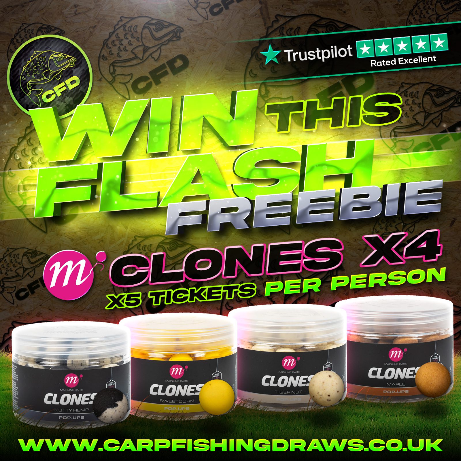 The live draw will take place on the Carp Fishing Draws Facebook page using Google’s random number generator to select the winning ticket number from all Entrants.