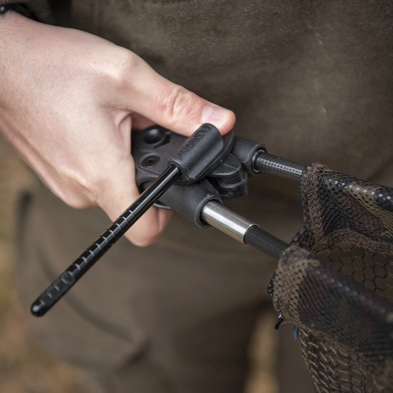 The ultimate solution for easy landing net set-up and break-down. At the heart of the design is a unique moulded, glass-filled nylon spreader block with a removable lever. The leaver is simply pushed in open the arms or pulled out to collaps them, making set-up and pack-down fast, easy, and fail-safe. The landing net arms feature magnetic arm sleeves that pull securely into the spreader block. Once in place, the lever can be operated effortlessly with one hand to lock the arms firmly into position—and just as easily reversed to collapse them. For added versatility, the lever can be screwed securely into the spreader block to create a retaining feature when used with the bankstick or storm pole retaining collar. This collar drops neatly into Fox Camlok banksticks and Storm Poles and locks securely with the cam system. The 2K carbon pole features a reduced taper design, improving flex while ensuring superb stiffness. A shrink wrap handle offers enhanced grip, and a stainless-steel pointed butt cap provides durability. The camo mesh completes the premium build, blending performance with style. Available with 42-inch arms, paired with either a 6ft one-piece pole or an 8ft two-piece pole.