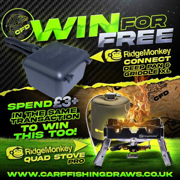 Spend £3 or more in the same transaction, and you’ll be playing to win a RidgeMonkey Quad Stove Pro as well!