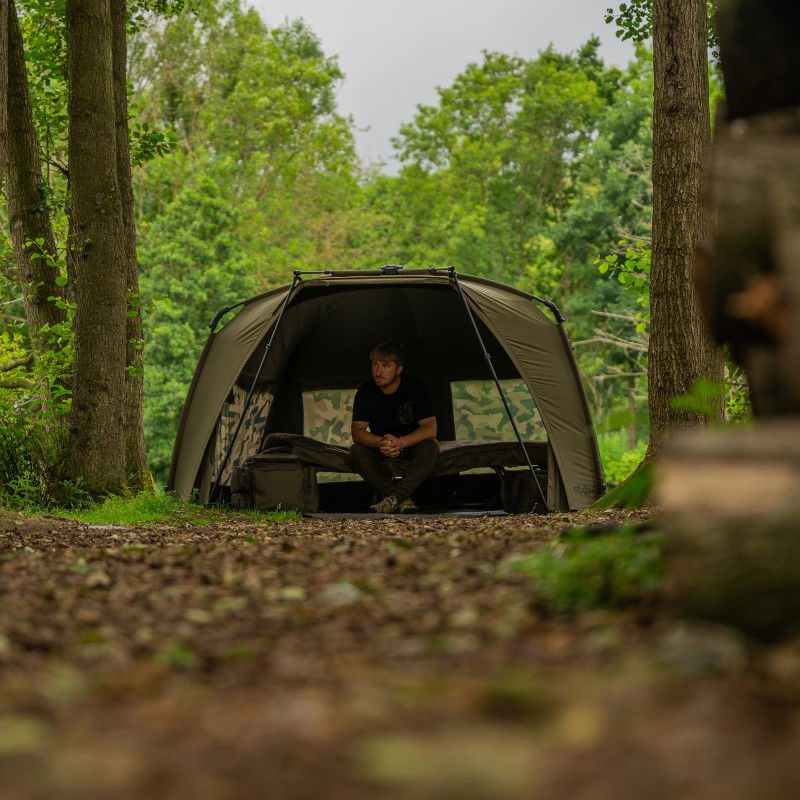 Avid Carp Exo+ Bivvy, a generously sized one man shelter with over 5 years in testing and development. A well thought out Bivvy from the ground up with a super fast erection time and supplied with a heavy duty groundsheet and storm cap roof. Manufactured from a high performance 20,000MM HH fabric and featuring the black out EX material inside that keeps light to a minimum allowing for much needed shuteye during daylight hours if you’ve had a busy night. Four camo mozzi meshed vents keep plenty of air movement going on warmer days and a solid infill panel featuring 2 door options, a Solid and Camo Mozzy mesh, for increased airflow.
