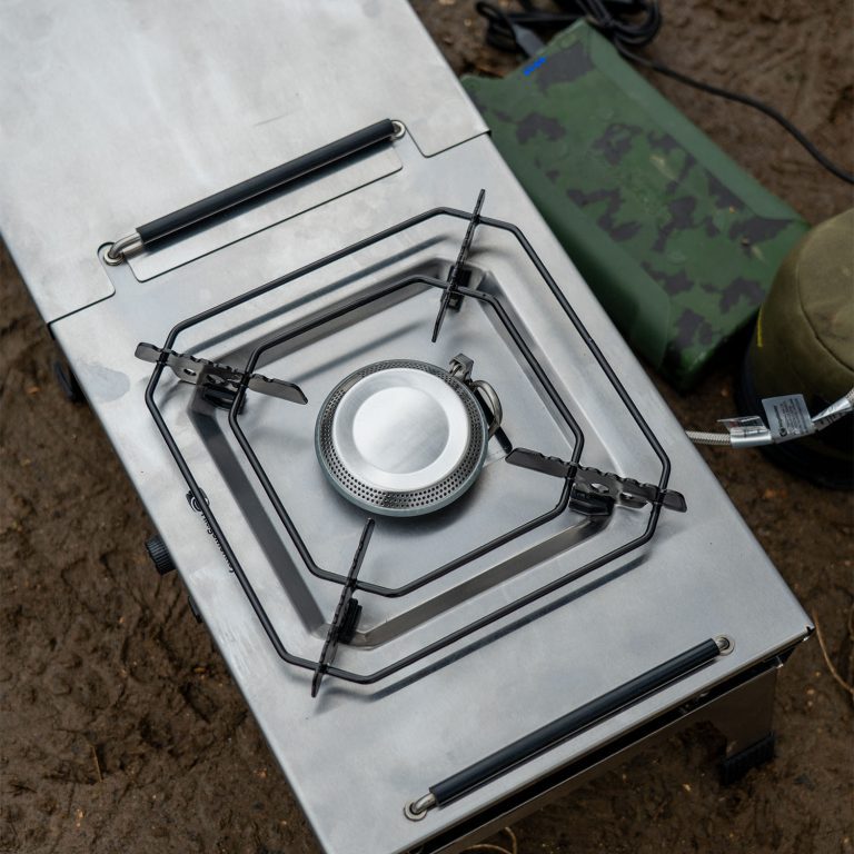 A simple and direct interface features a straight-forward ignition button and gas control knob, allowing you to finely adjust the size of the flame (and therefore temperature) you require for precise cooking. A pre-heat pipe wraps around the burner to ensure the unit performs efficiently, especially in low temperatures, by optimising gas vaporisation. When combined with the EcoPower USB Heated Gas Canister Cover (sold separately) the gas is gently warmed up to provide optimal fuel efficiency, making the most of every last drop – even in the coldest conditions. Ideal for use on a tabletop, bench or shelf, the rubber feet on the folding legs help the unit to stay firmly in place and protect delicate surfaces. A rubber-capped pan support ensures that your cookware remains securely in the optimal position at all times, sitting within an easy-to-clean recessed drip pan. Dual rubber-gripped handles on the sides allow the unit to be moved easily whilst in use, whilst being able to slide out or tuck away neatly when not required. A side table simply slots on to either end of the CookStation, depending on your preference and space requirements, offering a robust, flat and clean extended surface for storage or food preparation.
