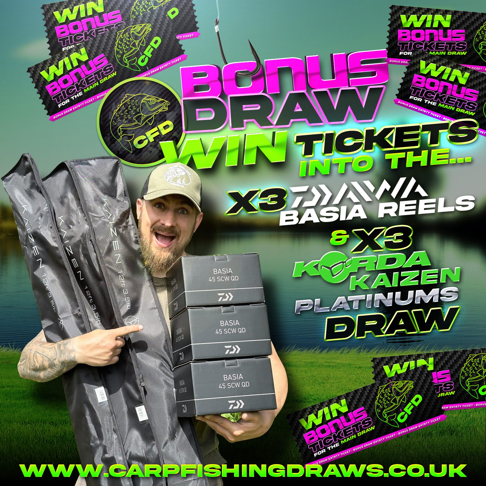 The live draw will take place on the Carp Fishing Draws Facebook page using Google’s random number generator to select the winning ticket number from all Entrants.