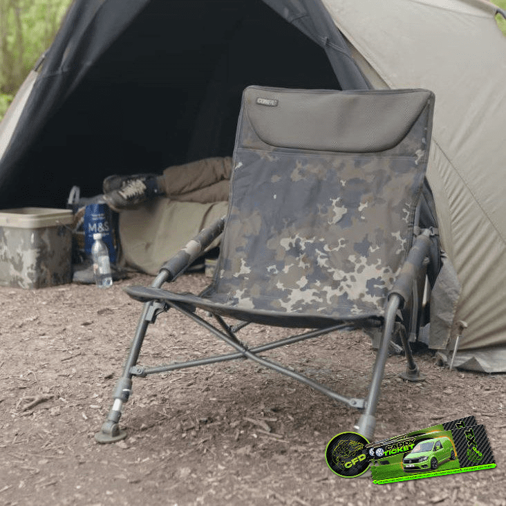 The Compac Low Chair in dark kamo features a lightweight frame and concertina design. These features not only make the chair extremely lightweight but also very compact, making it ideal for loading onto a barrow, packing away in your bivvy or for transportation.
