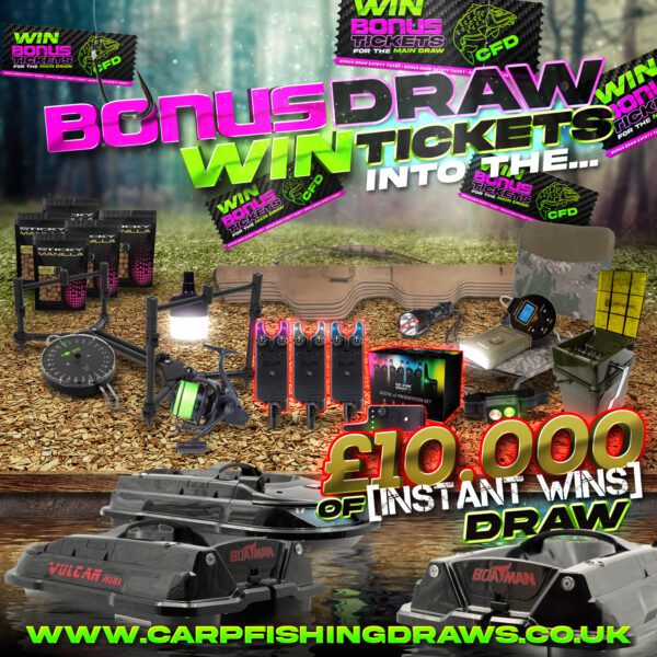 The live draw will take place on the Carp Fishing Draws Facebook page using Google’s random number generator to select the winning ticket number from all Entrants.