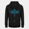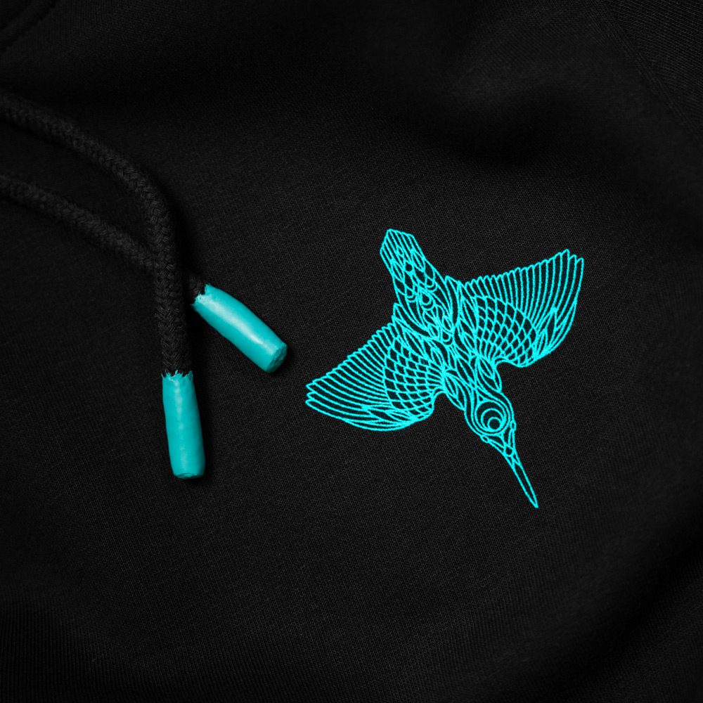 βTake Flightβ – a graphic homage to the iconic Kingfisher. Utilising a keyline illustration style to represent rapid movement, the electric blue and copper hues simply pop in this piece and take on an almost 3D appearance. 4 colour screen print on our super soft luxurious 320g brushed back fabric with colour-matched dipped cord ends.