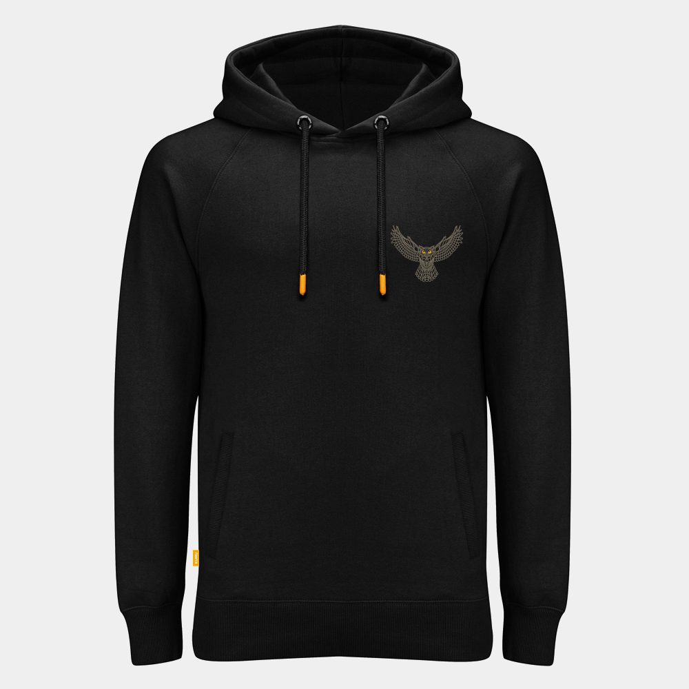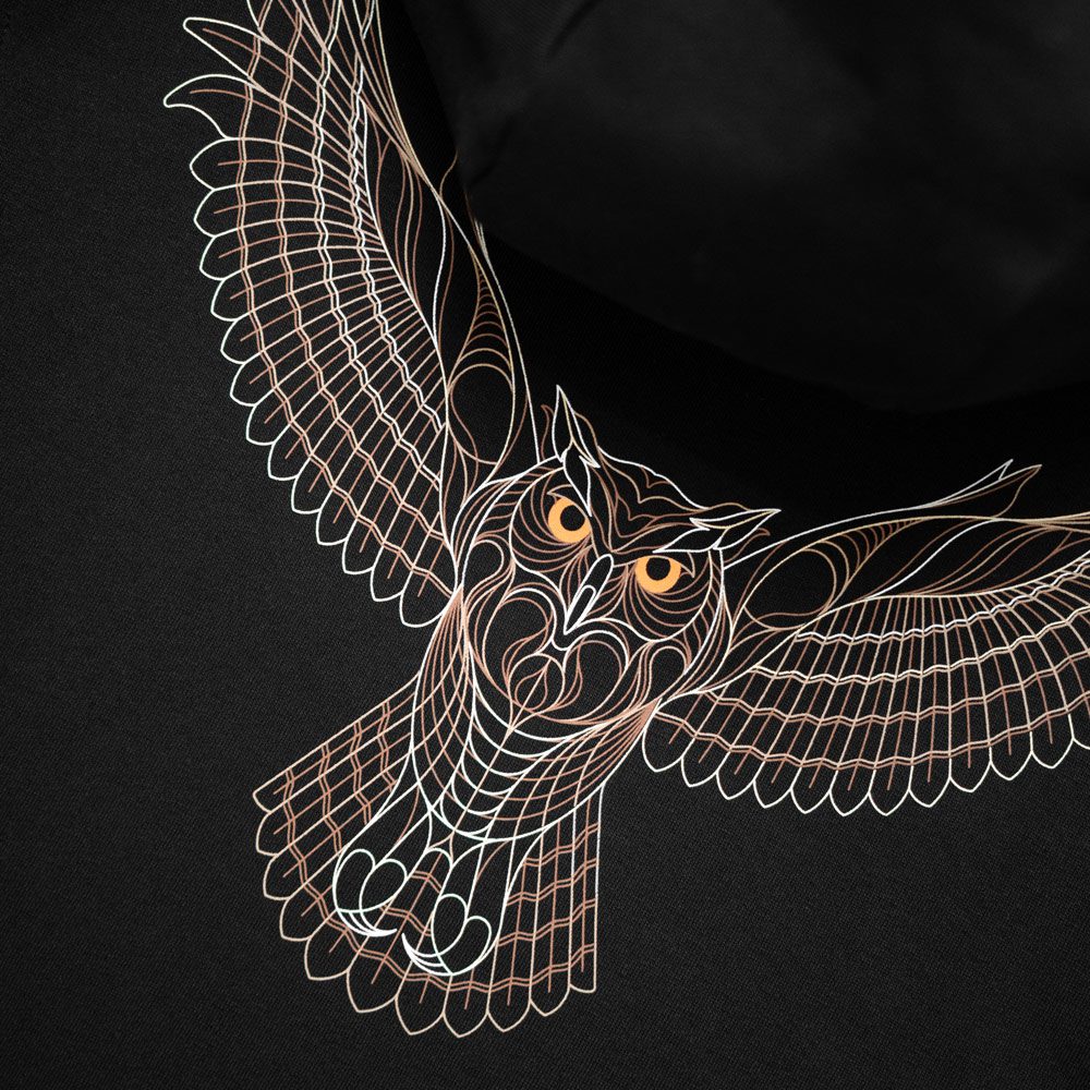 The sight of an Owl silently floating past overhead hunting its’ prey is one we truly relish when sat by the waters edge at witching hour. Our ‘Hunter’ graphic pays homage to this majestic creature. Created utilising an keyline style to capture the gentle, silent movement of its feathers. Intricate 5 colour screenprint on a super soft, 320g organic fabric with woven side tab detailing.