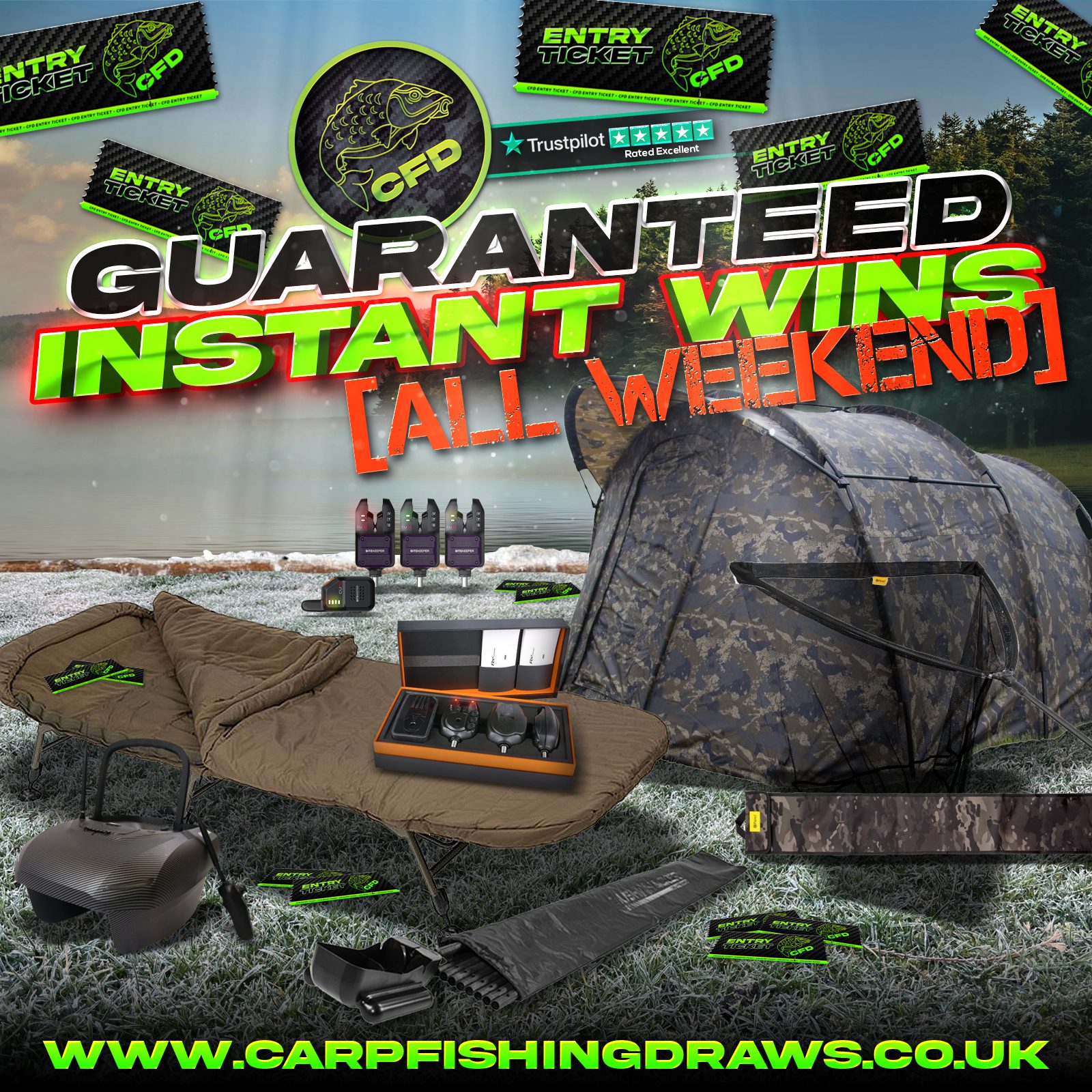 You may enter the competition online or for free by post by sending your entry to Carp Fishing Draws on a postcard. You must have an account on Carp Fishing Draws for your entry to be processed. All details on your entry MUST correspond to the details on your account to receive the order confirmation and ticket number. Postal entries received without a registered account cannot be processed.