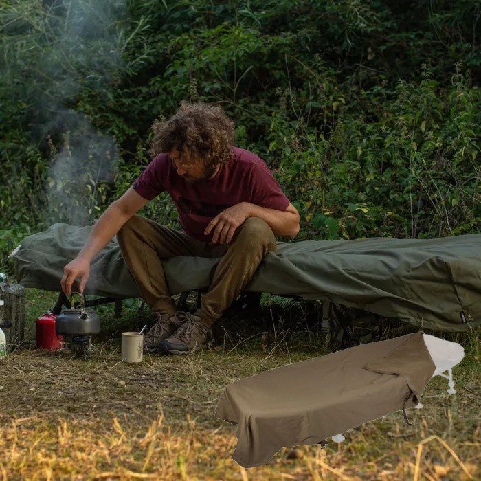 The DRYKORE Bedchair Cover is designed to keep you dry and comfortable all year round, thanks to it being waterproof and breathable. It features a 15K hydrophilic layer to ensure that water can’t get through – should you sit on it in wet clothes; get condensation dripping on it; or decide to do the night under the stars – plus it is breathable to help ensure that you don’t sweat and that moisture can’t form inside it. As well as keeping your sleeping bag and bedchair dry, it will also keep you warm as the material prevents any draughts getting through it, and it features a fleece lining which can be zipped in and out as required, depending on the time of year. The DRYKORE Bedchair Cover has been shaped to provide a good fit to your bedchair without hanging down on the ground, but at the same time giving you the space to move around inside it. It attaches to your bedchair via several straps which are quick to clip in place, which ensure that it remains in place even if you have to make a quick exit during the night. It is olive green in colour.