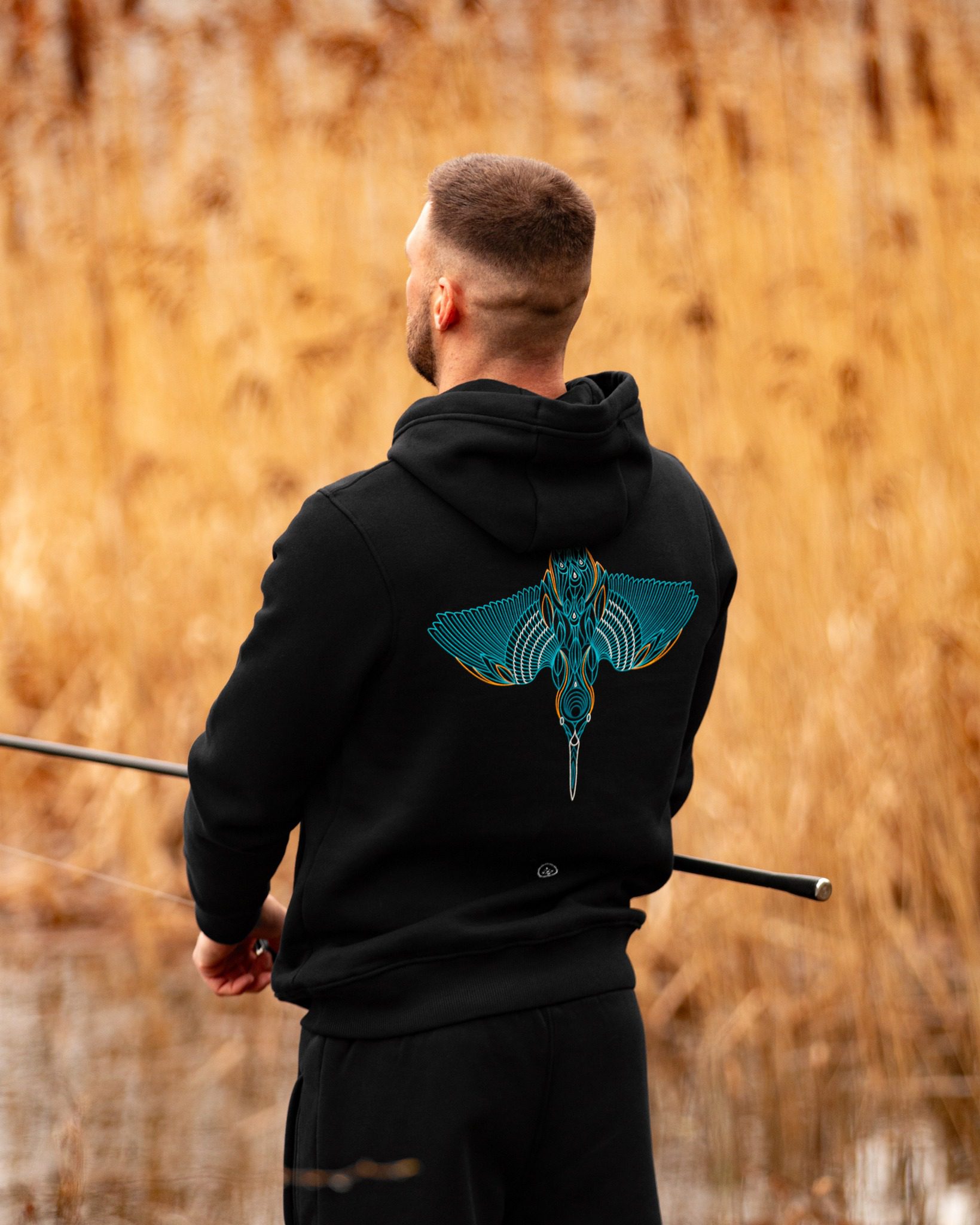 βTake Flightβ – a graphic homage to the iconic Kingfisher. Utilising a keyline illustration style to represent rapid movement, the electric blue and copper hues simply pop in this piece and take on an almost 3D appearance. 4 colour screen print on our super soft luxurious 320g brushed back fabric with colour-matched dipped cord ends.
