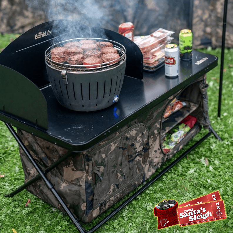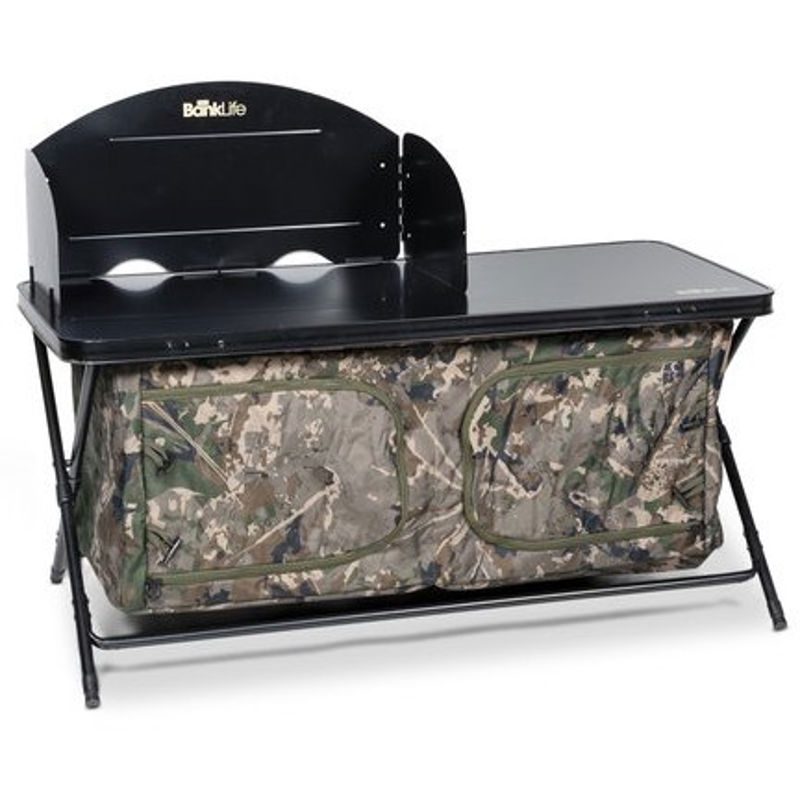Ideal for social sessions and cooking with some creativity the Bank Life Cook Station has a folding three sided windshield that drops in on pins to give you a windproof area for kettles and stoves and also prevents items being blown off the table top when used as a work surface.