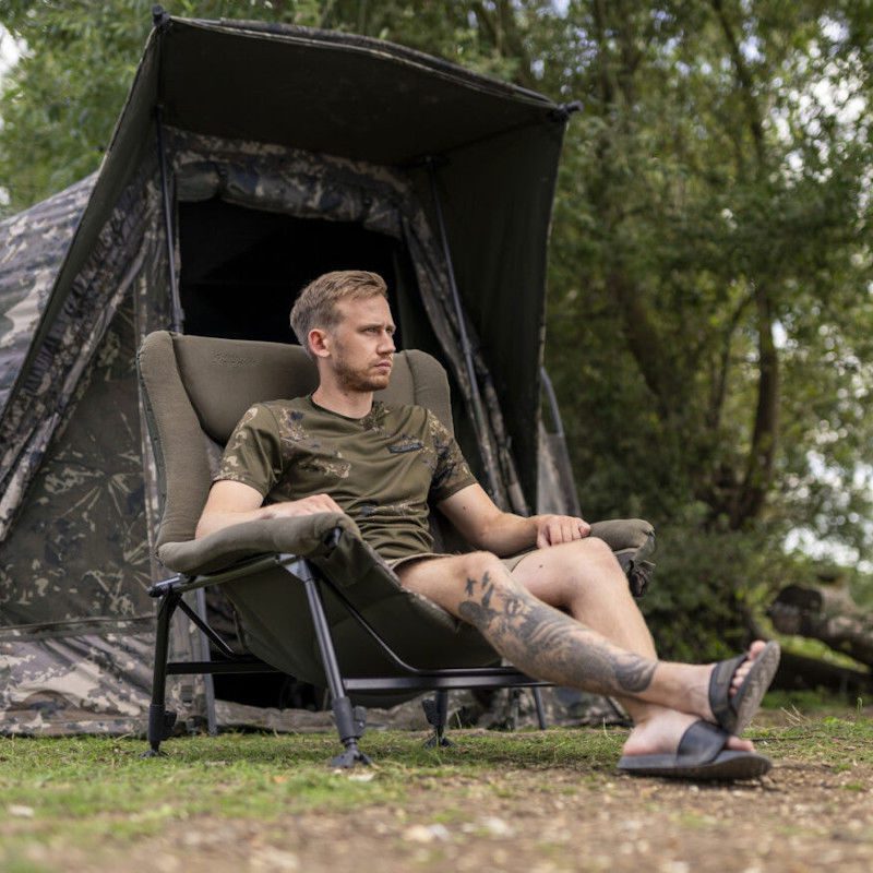The Nash Indulgence Emperor Chair Camo offers you the ultimate in bankside luxury seating. A deep bucket style seat with an insulated hollow fibre base and generous peach skin surround. With two mesh pockets to keep essentials and valuables like keys and phones and alarm receivers to hand. Plus an additional elasticated drinks holder too. With one touch adjustable legs capped with mud feet getting you properly level on even terrain.