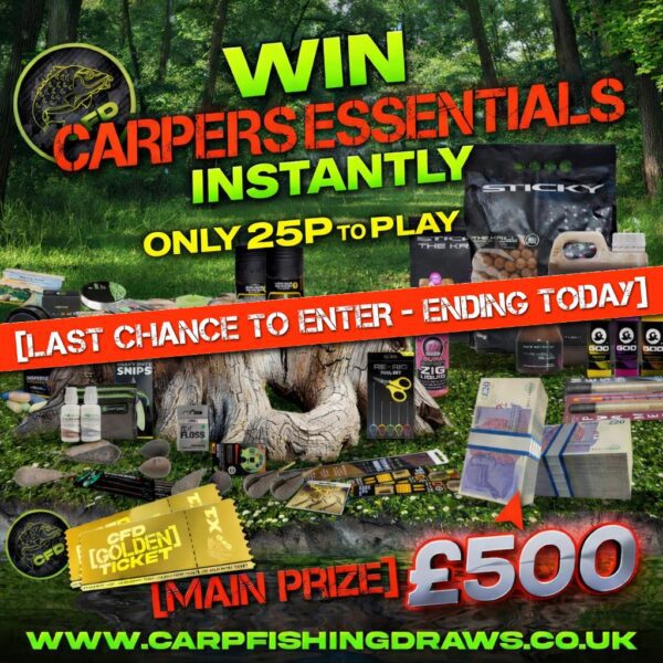 The live draw will take place on the Carp Fishing Draws Facebook page using Google’s random number generator to select the winning ticket number from all Entrants.