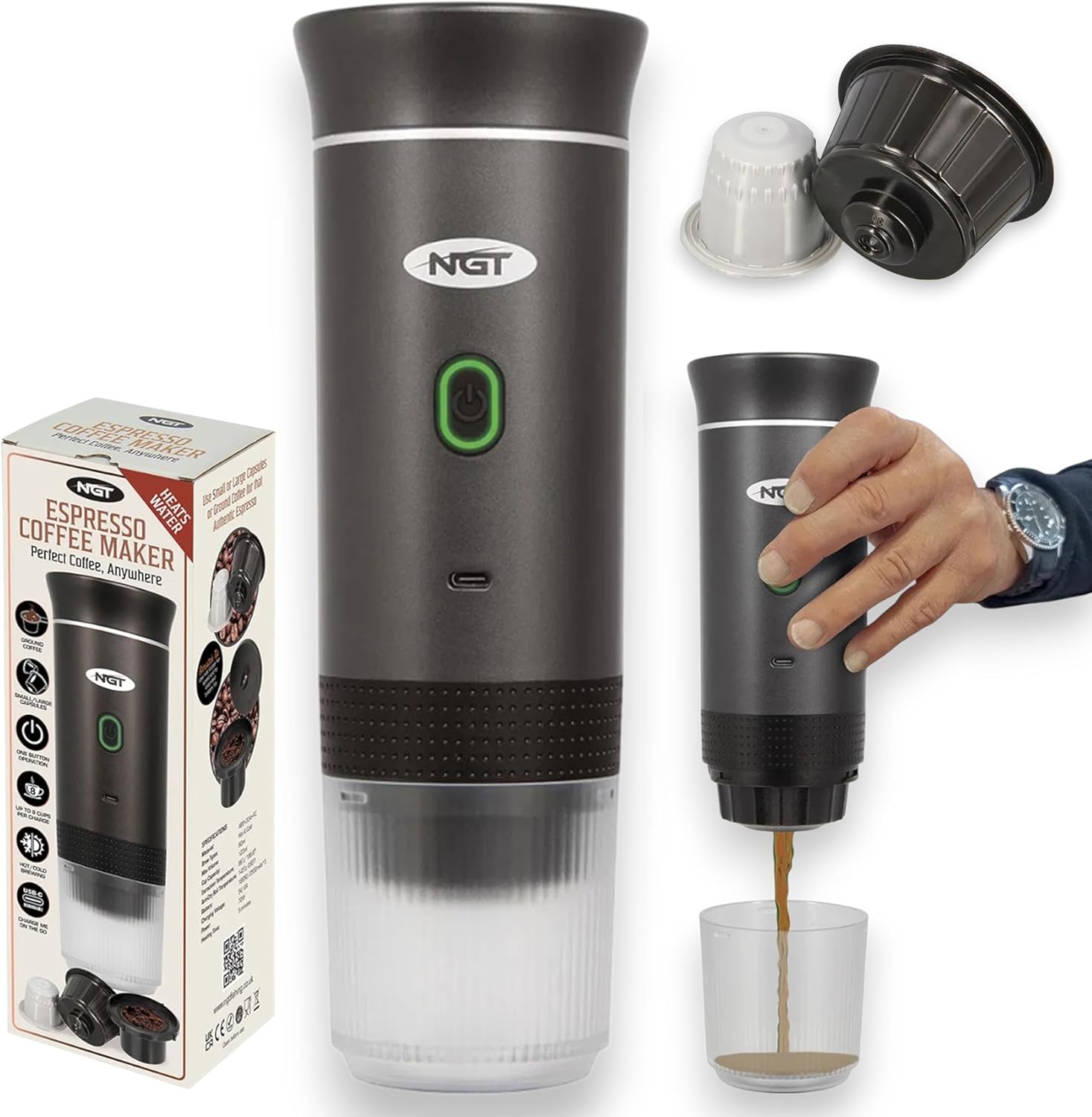 NGT Portable Espresso Coffee Machine Rechargeable USB NEW Fishing Latte Mixer *GREY* The NGT 3-in-1 portable coffee maker sounds like a versatile and practical solution for coffee lovers who are always on the move! Whether you’re at the bank, on the road, or relaxing at home, having a portable coffee maker can offer convenience and ensure you have a fresh cup of coffee anytime, anywhere. With its 3-in-1 functionality, it likely combines brewing methods such as espresso, drip coffee, and maybe even a French press or cold brew options. Having multiple brewing styles in one compact unit is perfect for different preferences and situations. Features include: 3 x 18650 2500mAh batteries providing 7500mAh capacity 60ml water tank capacity 120ml cup capacity 86°c / 186.8°f extraction temperature 145°c / 293°f anti-dry boil temperature USB-C connection for easy charging on the go Up to 4 extractions using the inbuilt heating element with cold water Up to 50 extractions with a cold brew or using pre-heated water Size: 8.35cm x 24.55cm Colour: Grey Brand: NGT Lidsters Fishing Supplies LTD