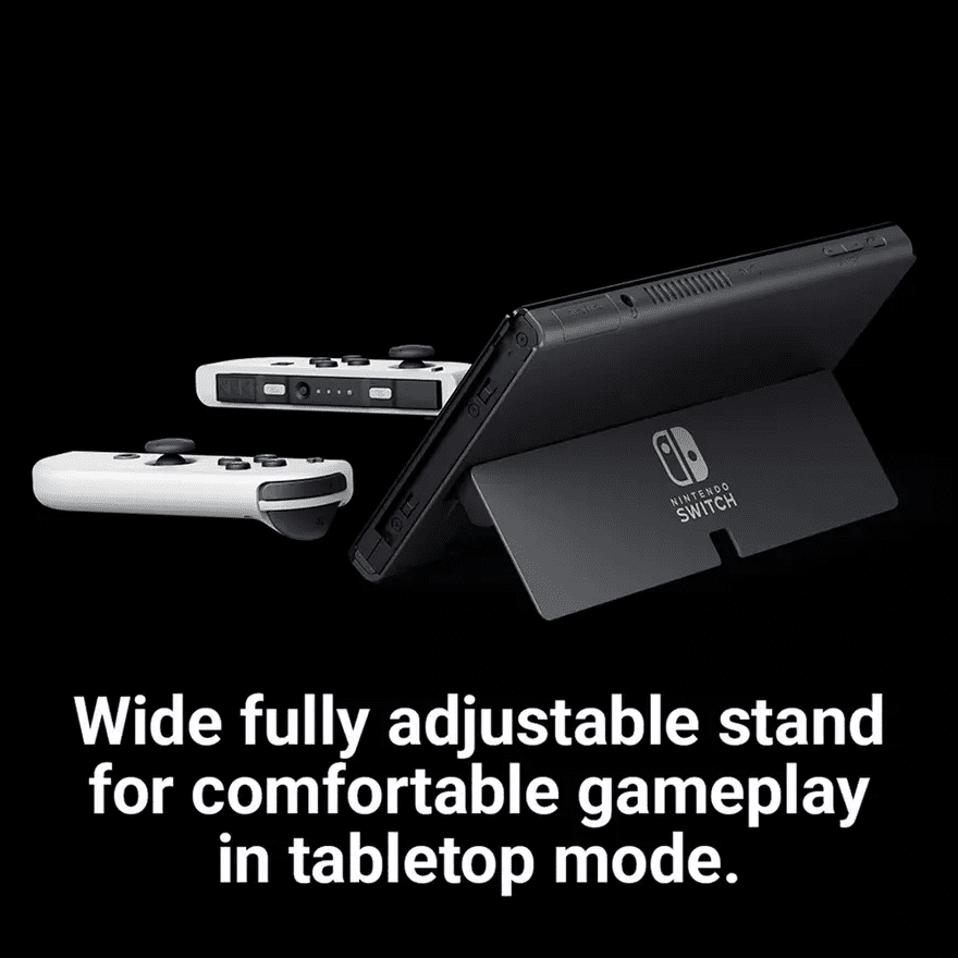 • Flip out the stand and hand a controller to another player to share the screen and enjoy competitive or co-operative multiplayer, anytime and anywhere. Nintendo Switch (OLED model)’s wide adjustable stand can be set to your preferred viewing angle for comfortable gameplay in tabletop mode.