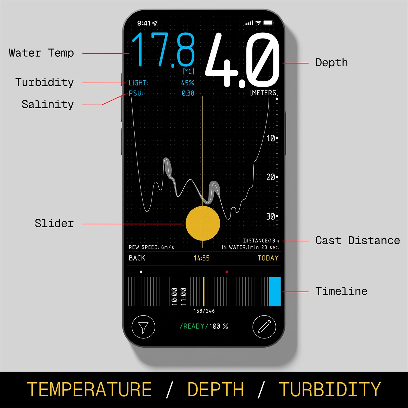 PROBE the first smart sensor with cutting-edge technology providing anglers with precise information on depth, temperature, and water clarity at the exact position of their hook bait or lure.