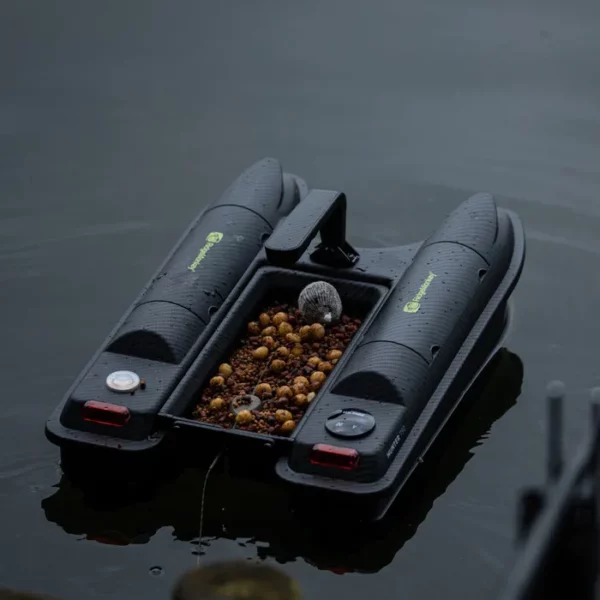 It’s the first ever fully top-loading bait boat too, this industry first means that there’s no longer any need to fiddle around underneath and insert your baited rig into the hopper from below, thanks to the clever design of the bait delivery system, which can accommodate up to 1kg of bait. The super-quiet twin motors feature built-in weed guards, while the sleek design ensures it cuts through the water with ease and the built-in lights to the front and rear make for an easy approach, delivery and return from your spots at night. Cruise control / Auto drive also enables you to send the boat out or bing it back in a straight line without having to hold the thumbstick for the duration, simply press it forwad for five seconds and cruise control is activated.
