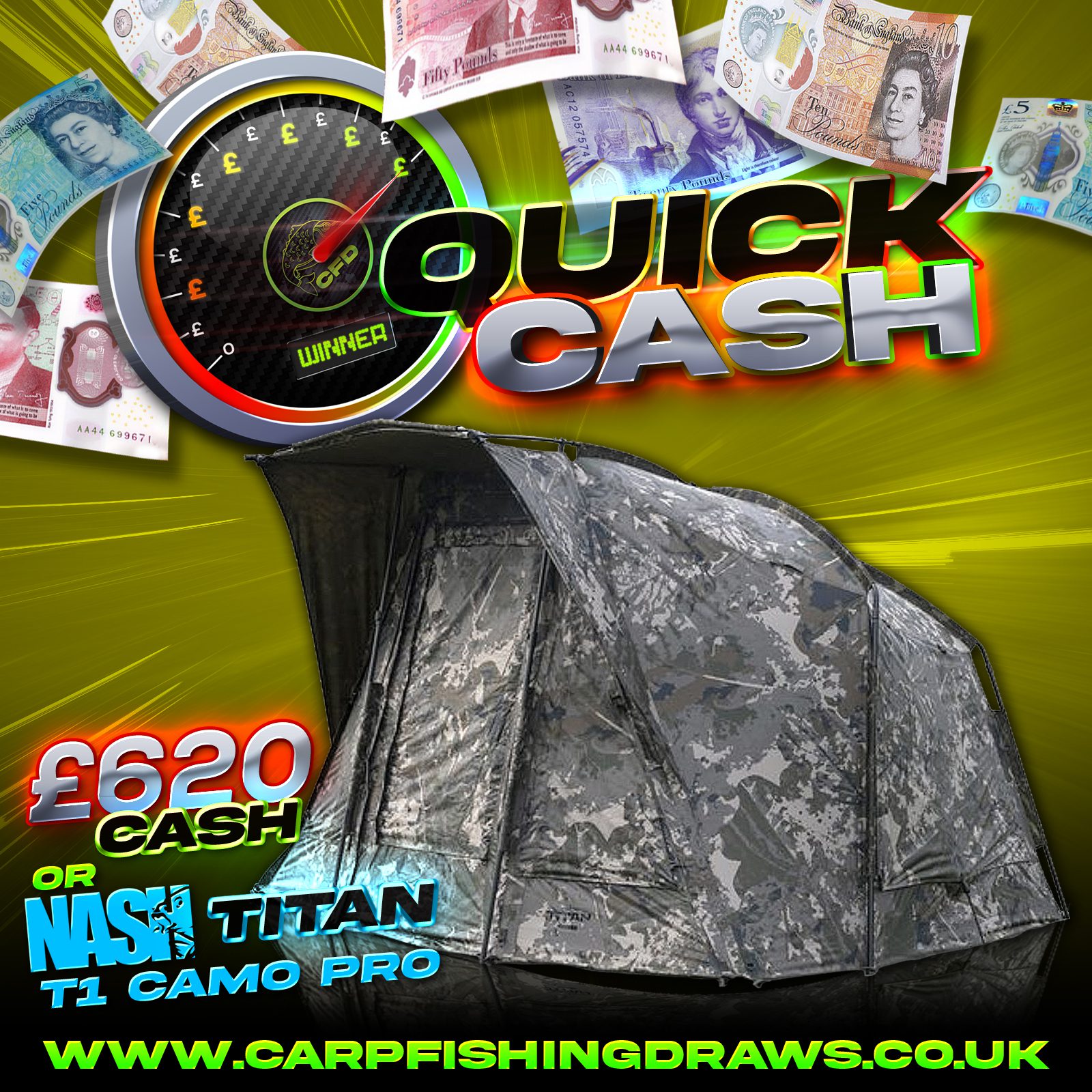The live draw will take place on the Carp Fishing Draws Facebook page using Google’s random number generator to select the winning ticket number from all Entrants.