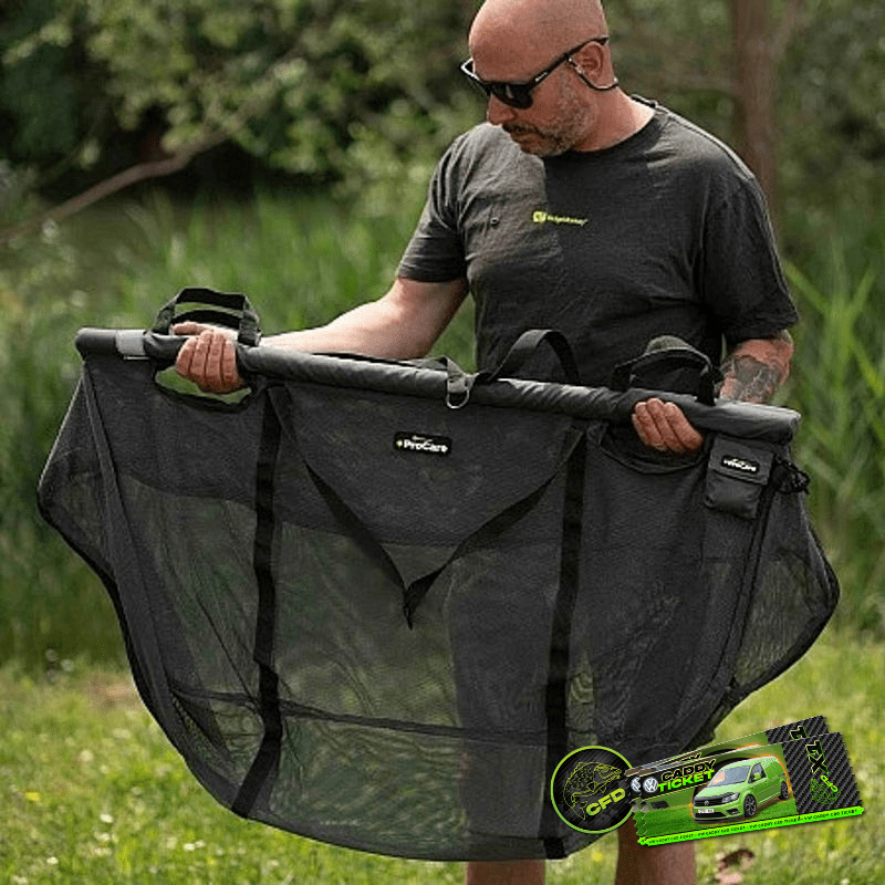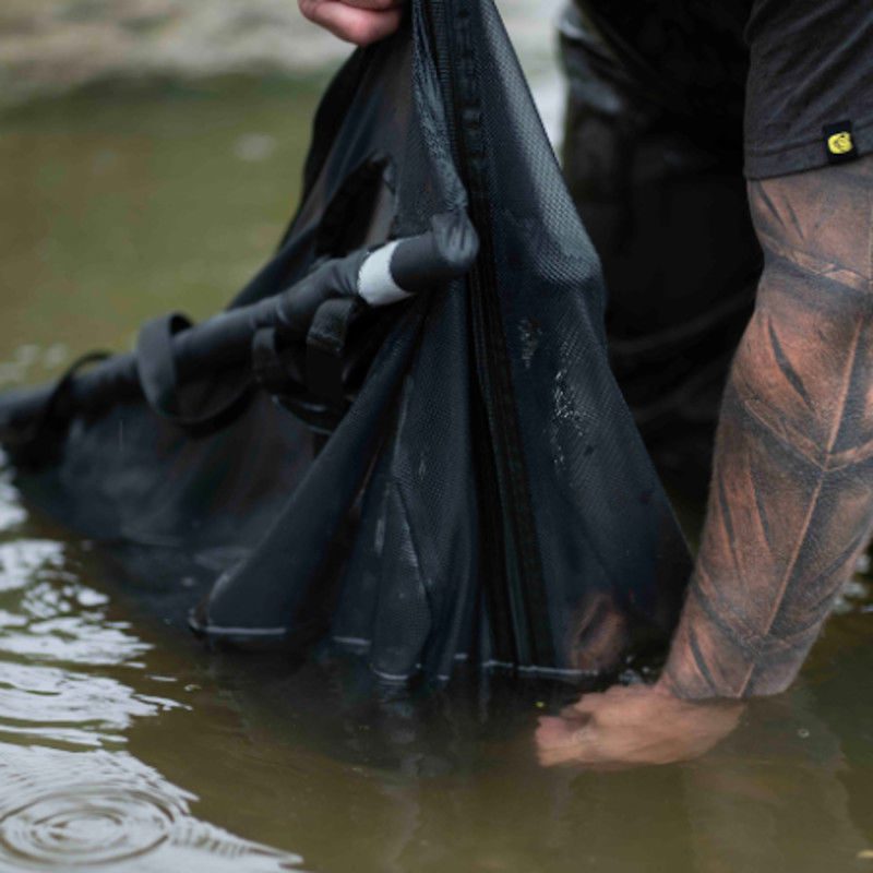 The Ridge Monkey ProCare Retainer Sling, a two in one short term retainer and weigh sling with a soft free-flowing mesh for rapid drainage. Featuring a unique soft elongated front zip for simplified access, covered by an inner zip baffle. Full length floats for added stability and Hi-Viz reflector bands for easy visibility in low-light conditions. With carry handles at both ends for easy lifting and carrying plus heavy-duty weigh straps with large, fixed weighing loops. Supplied with a retention cord, 3/8 threaded split ring and stink bag travel sleeve.