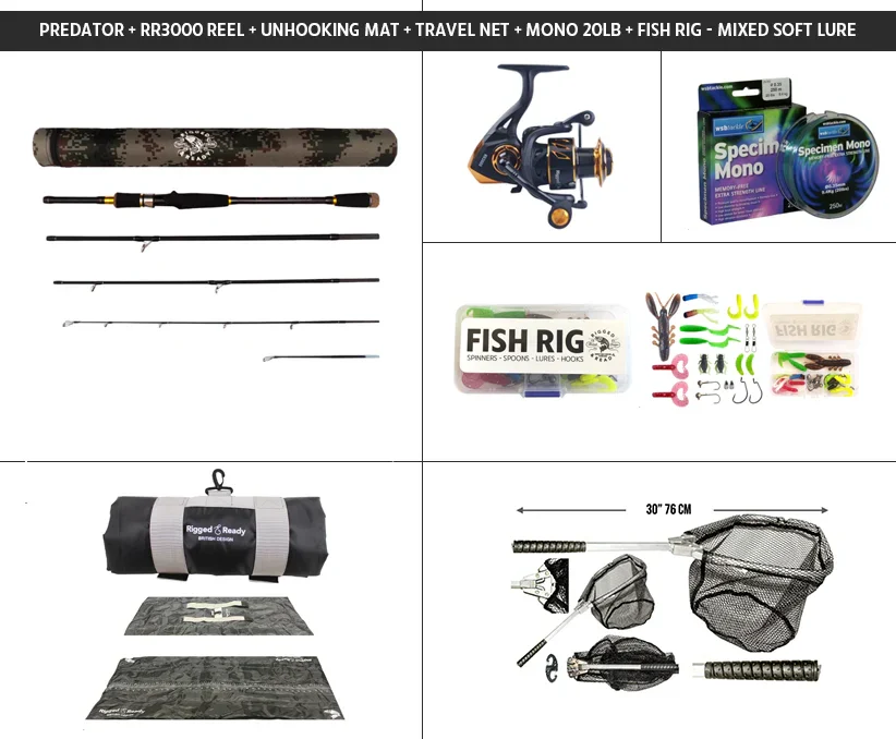 Target predators with confidence! The Predator rod and RR3000 reel give you the power and control needed for chasing pike, perch, and zander. This kit also includes an unhooking mat, landing net, 20lb mono line, and a mixed soft lure rig to get you fishing right away. A complete predator angling setup at an unbeatable price.