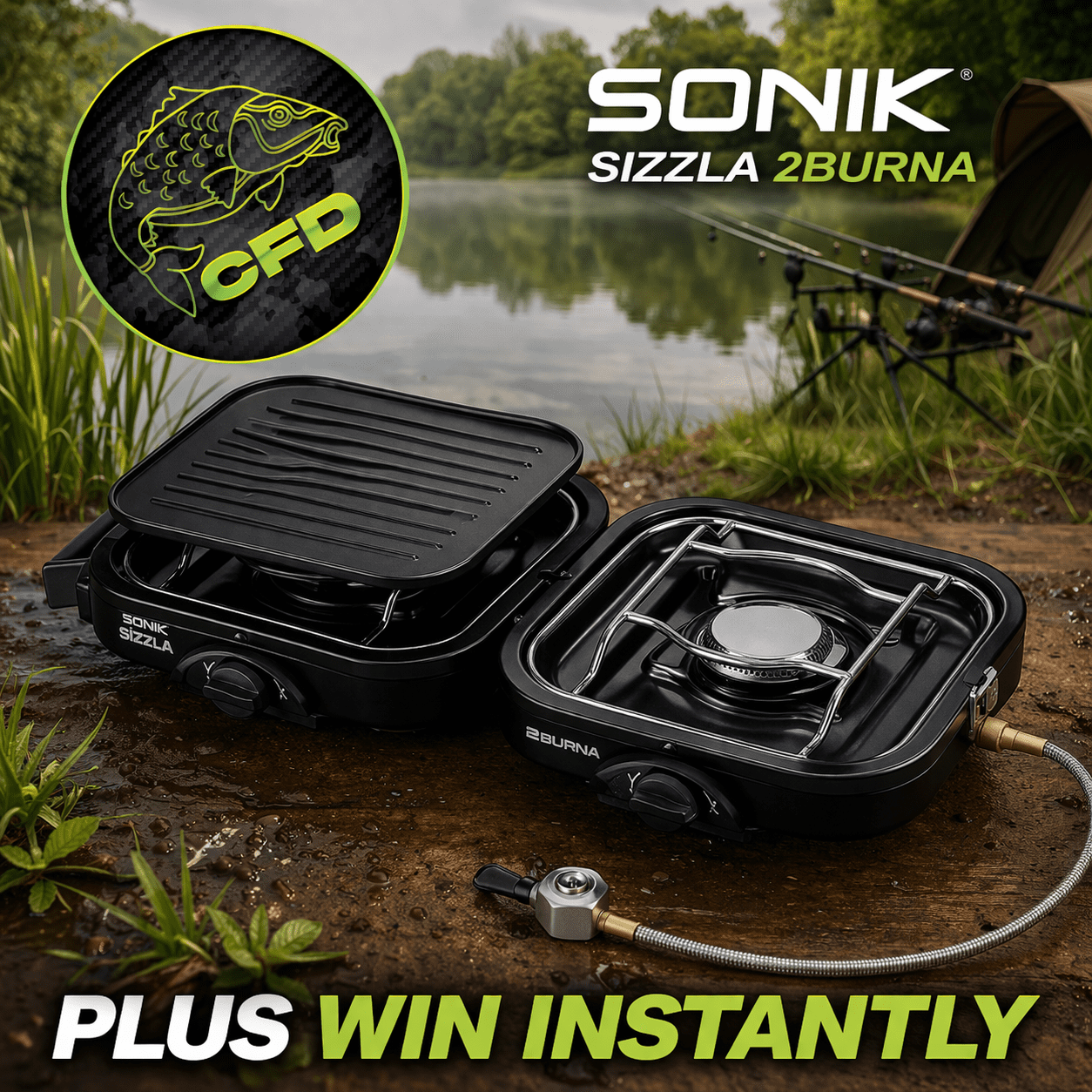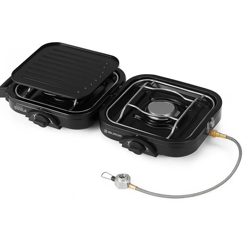 The Sizzla 2Burna is a perfectly portable two-burner camping stove, ideal for bankside cooking. It features independent dial controls, push-button ignition, and a quick setup design – simply fold out and connect your gas canister.