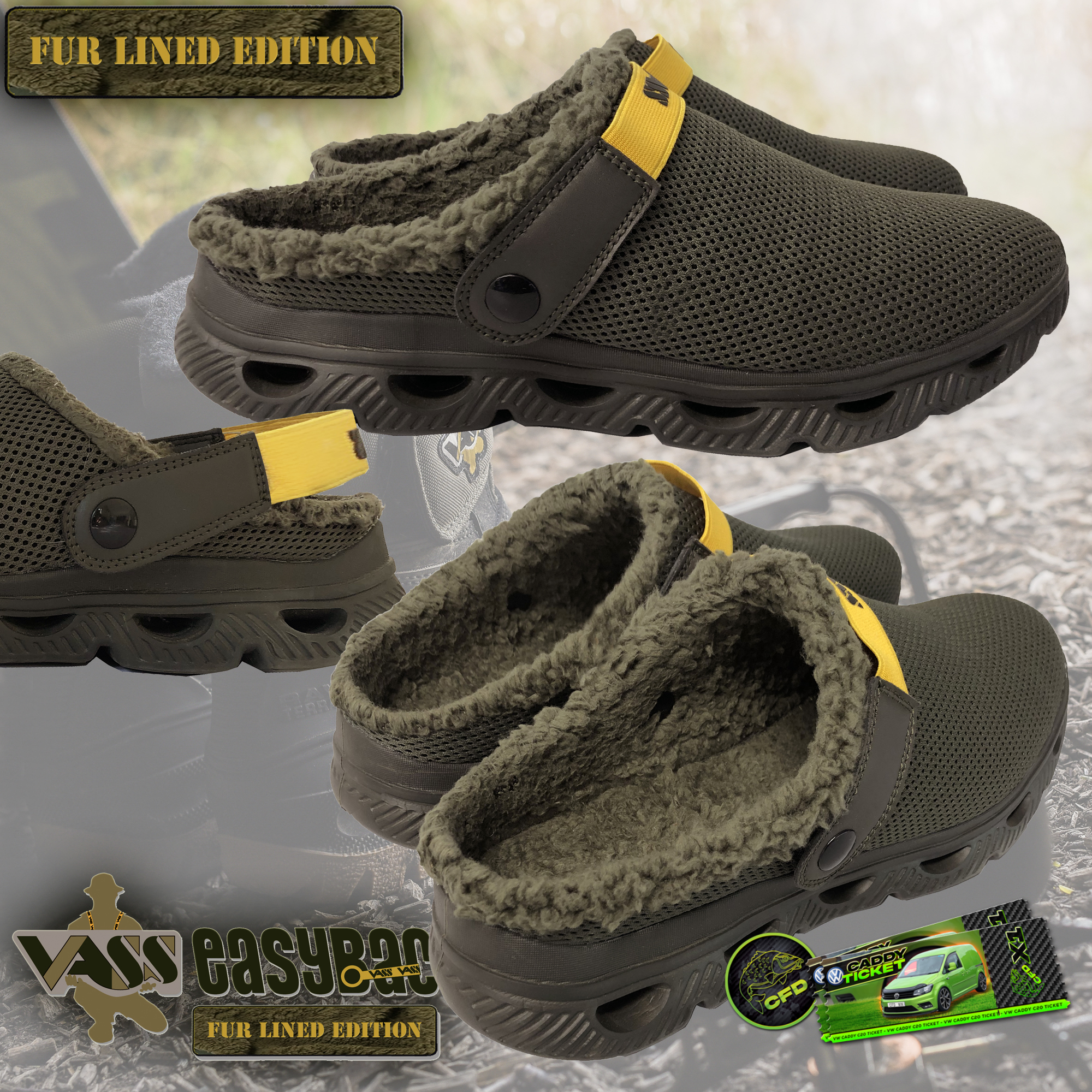 Vass Easy-Bac Fur Edition Fishing Trainers, a special edition of the comfortable extra light Vass Easy-Bac trainers with a fur lining. Super quick and easy to slip on in a hurry, they make ideal footwear for dashing out of your bivvy. With a moveable elasticated strap that can be pushed forward for fast access. That same strap can be pulled back over your heel for longer walks ensuring they stay put.