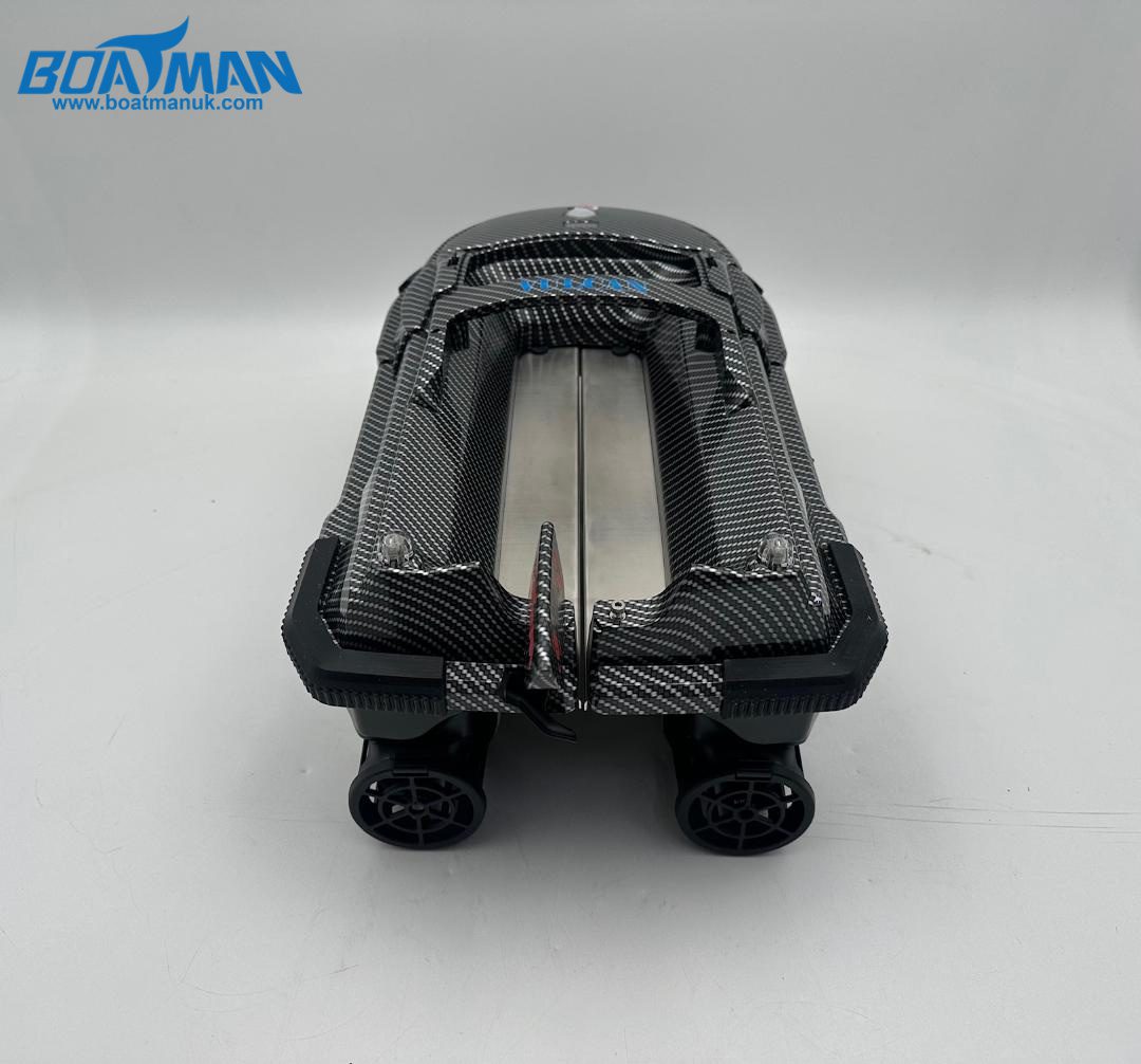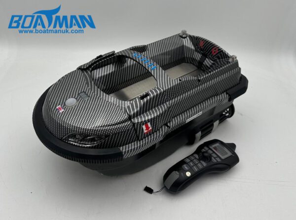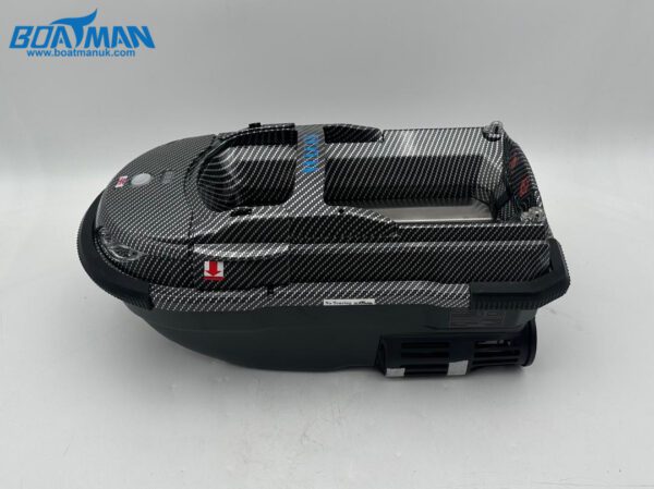 This boat has been designed here in the Uk by the Boatman Uk team. We wanted a boat with the ability to load the rig from the top which makes sending your rig and some free offerings an absolute doddle. The boats have 2 stainless steel bombay door style hoppers which can be opened individual or together, the doors are manual close. We have chosen a volt meter over a battery gauge, the minimum working voltage is 14. When the boats get to having less than 500 meters of range in battery life, the boats headlights will start to flash to warn you. If you go to a slower speed then the boat will go for a longer period of time. The boats come in 3 colours, Carbon, Black or Vulcan Camouflage. A feature we incorporated with the boat and remote is to be 100% waterproof The remote will float in water so if you have an accident you will not need to replace an expensive remote. The boat is also designed to be fully waterproof, Numerous test have been done where the boat has been submerged and no water is taken on, Most boats are only waterproof to a certain level whereas this is entirely waterproof. The boats take 2 10ah batteries which just slot in each side so no fiddly plugs to play with. The run time is between 2-5 hours depending on the chosen boat speed which is selectable on the remote. High speed is 60 meters per minute, medium is 45 meters per minute, slow is 30 meters per minute. The slow speed is ideal if towing a deeper etc for scanning the lake bead for features. There is and additional clip on handle supplied with boats for use when filling the hoppers to the top to avoid putting your hands in the boat. The motors have a built in weed guard / protector and are incredibly quiet, virtually silent. The boat will hold up to 2.5kgs of weight. As with all of our models the boats have 500m of range and have compass compatibility built in. The main board is easily accessible and is encased in a full waterproof casing which means if you have a basic version and wish to upgrade to GPS at a later date it is incredibly easy. The lights are very bright which is something we made sure was improved upon for night fishing, You will certainly not lose sight of this boat in the dark. As with all of the boatman boats now, these also have compass built into the board as standard